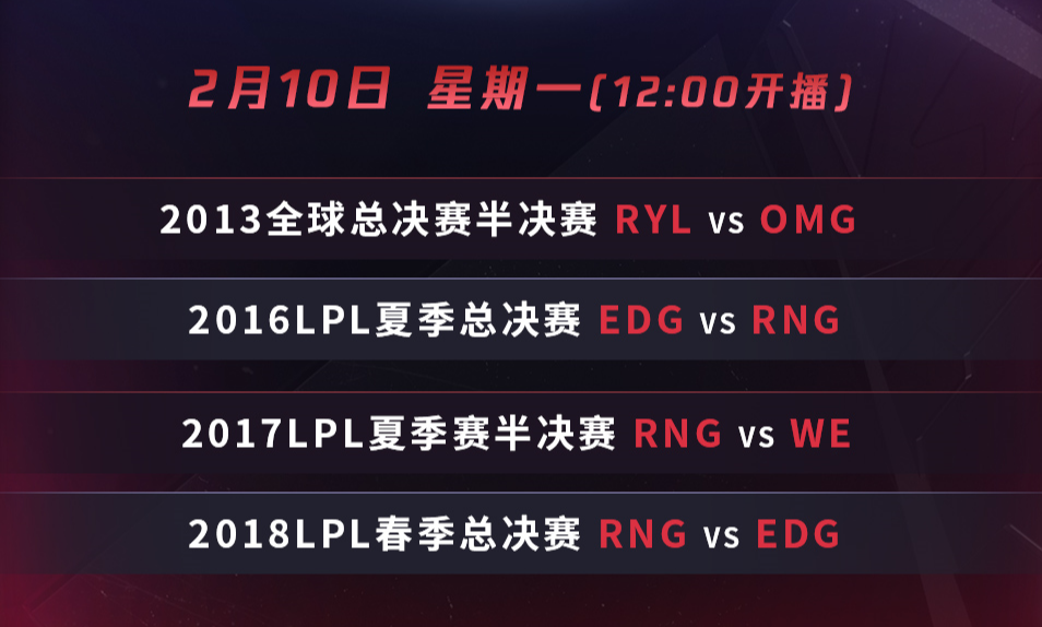 北京时间2020年2月10号,英雄联盟《LPL百大经典战役回顾》将在这一天为LPL粉丝们带来四场非常经典的赛事回顾。