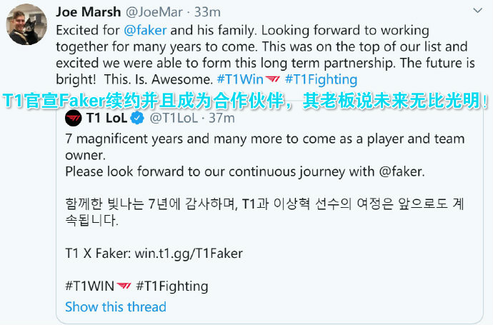 而在今天,T1官方宣布了一个重大的消息,那就是T1官方宣布了与Faker完成续约,同时Faker也将以选手及合作伙伴的身份与T1共同前行。随后T1老板转发了该消息,并为Faker加入一个新的大家庭而感到兴奋,期待在未来一起工作,同时,T1的老板还说未来是无比光明的。