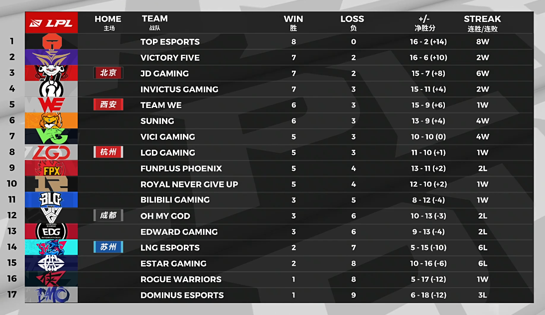 北京时间2020年7月13号,英雄联盟LPL夏季赛正式进入到关键的第七周。而从刚刚结束的第六周的战绩情况来看,除了TES依旧是以全胜的姿态领跑LPL夏季赛之外,第二名至第十名的争夺可以说是相当激烈,稍有不慎,队伍与队伍之间就会出现比较大的落差。当然了,对于第十一名至第十七名的队伍来讲,在接下来的比赛中甚至只有一到两次失利的机会。如果不能够尽可能多的赢下比赛的话,那么在这个第七周中也很有可能会出现几支已经是与季后赛无缘的队伍了。